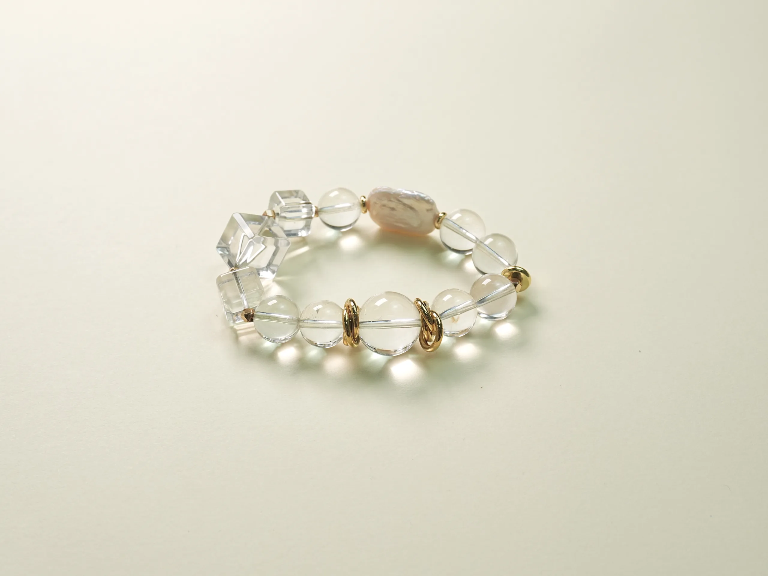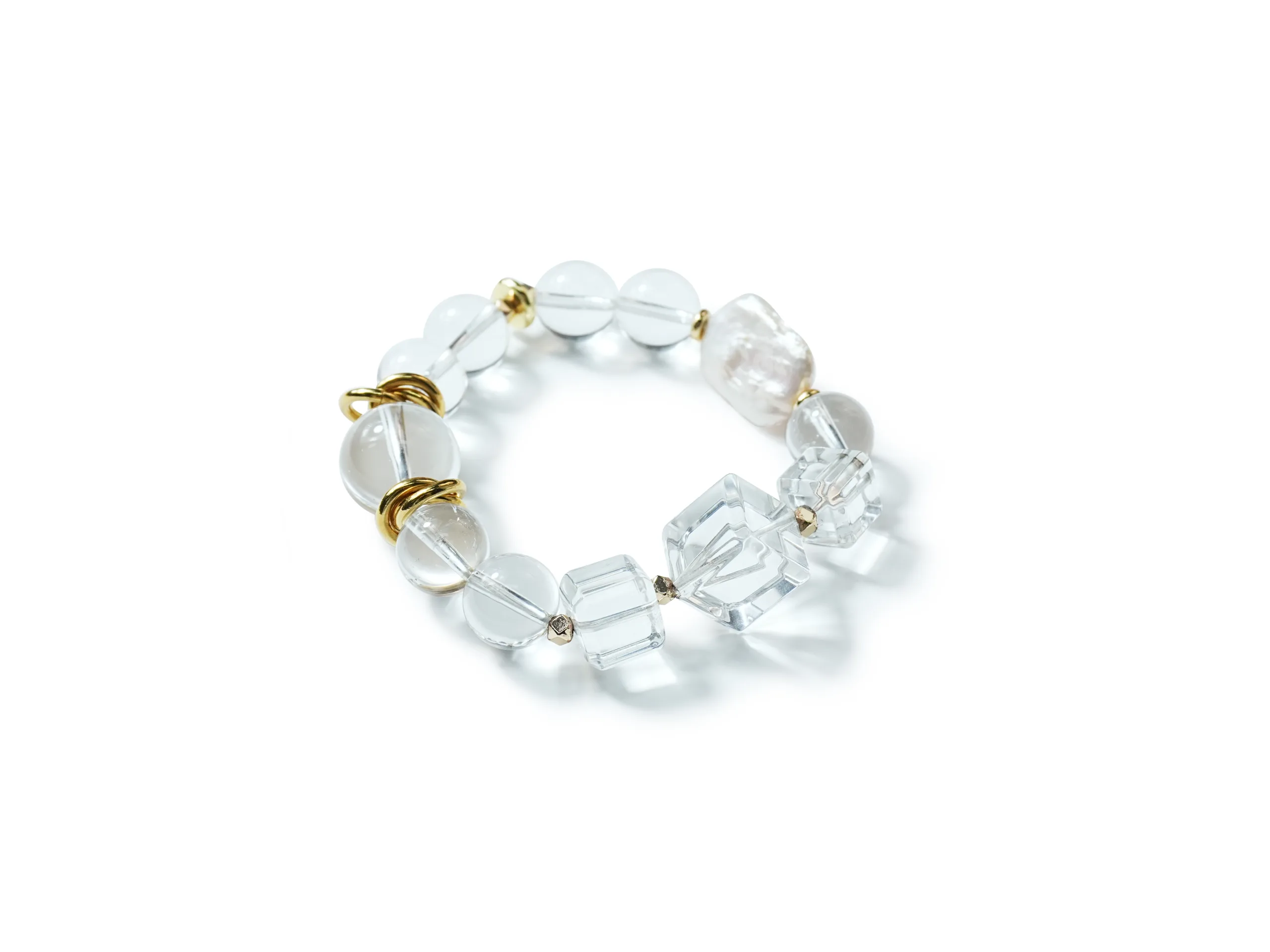 Beads: Clear Quartz (15mm); “Sugar Cube” White Crystal (14mm); “Sugar Cube” White Crystal (13mm); Baroque Pearl (15mm).