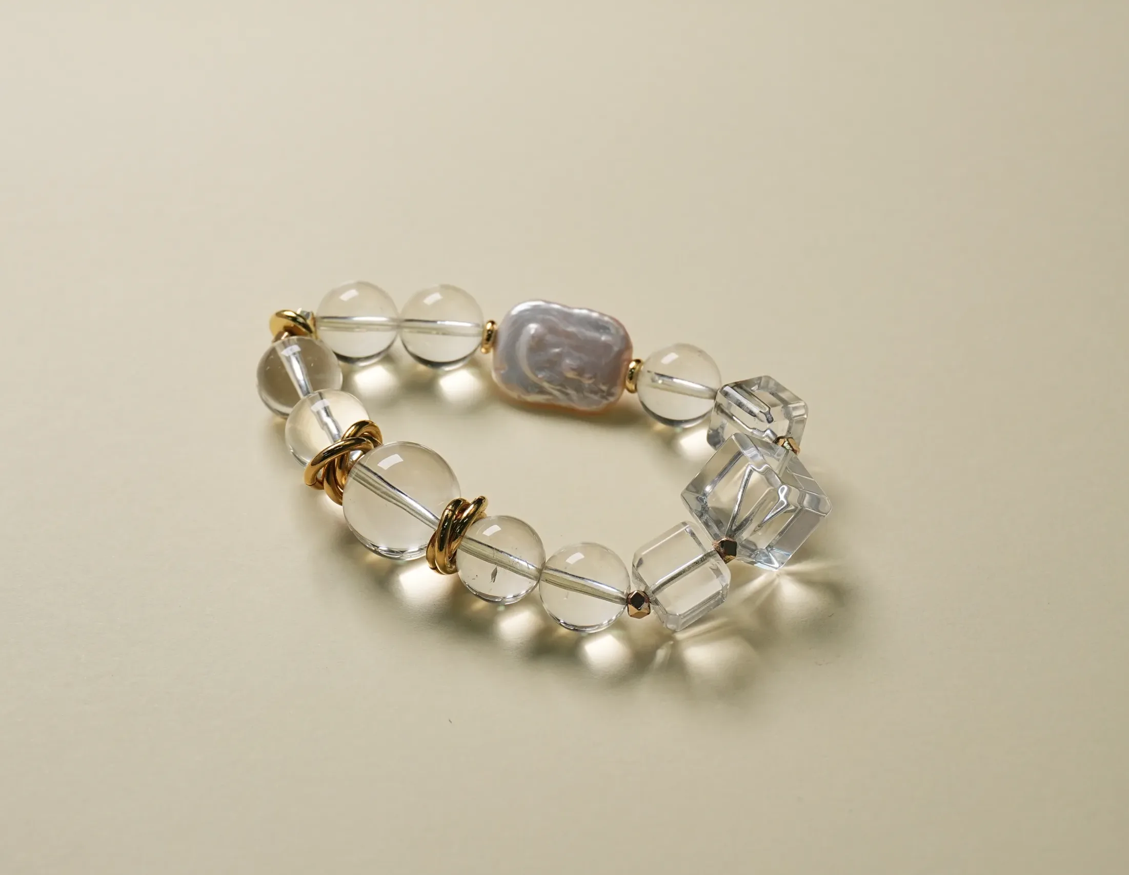 Design Inspiration: The geometry of modern cityscapes translated into wrist architecture. Round beads create flow, sugar cubes create rhythm, baroque pearl introduces organic disruption, metal accents ground the composition.
