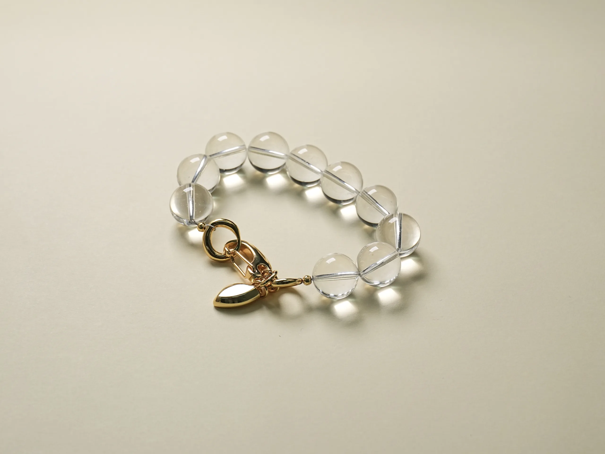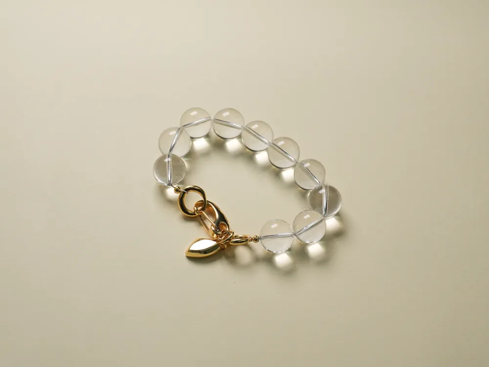 A full strand of 14mm clear quartz beads, paired with a 6cm metal clasp accessory.
